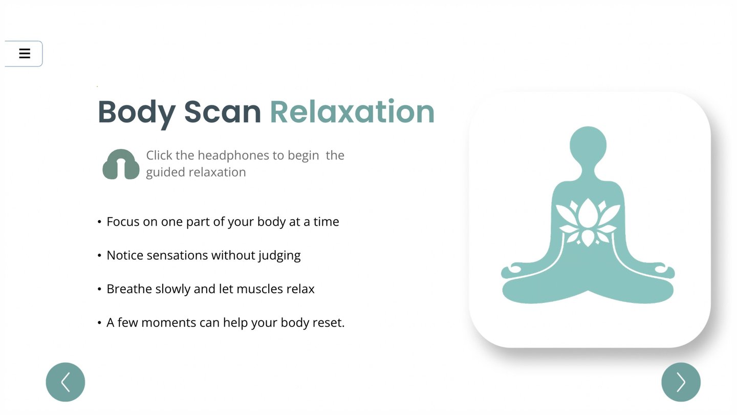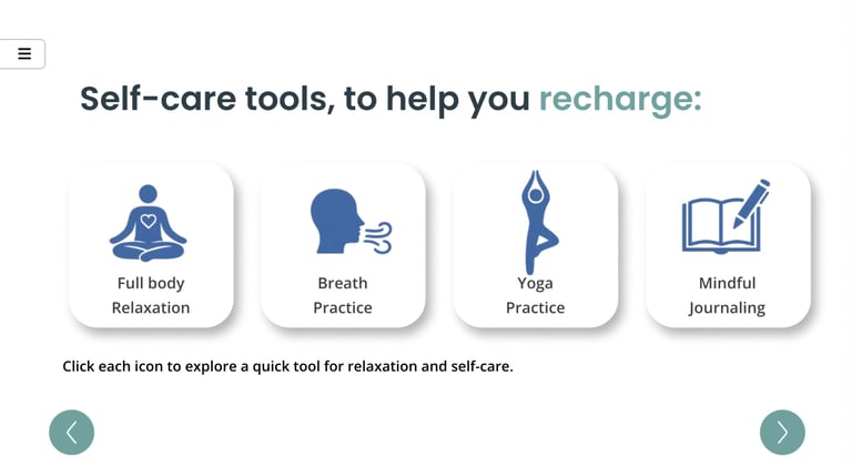 This interaction introduces learners to practical self-care strategies through icon-based exploration. Each icon opens short guidance and activities, allowing learners to choose techniques that match their needs and emotional state.