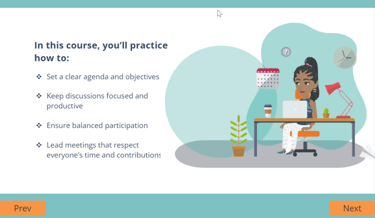 This scenario-based eLearning course helps lead project managers run effective, engaging meetings. Learners practice setting agendas, managing time, and encouraging balanced participation through realistic decision points and feedback.