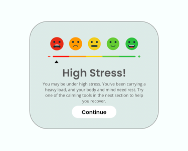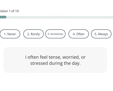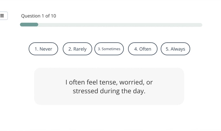 Learners begin with a gentle self-check to notice emotional state and stress levels. The quiz provides immediate feedback while maintaining a calm, supportive tone.